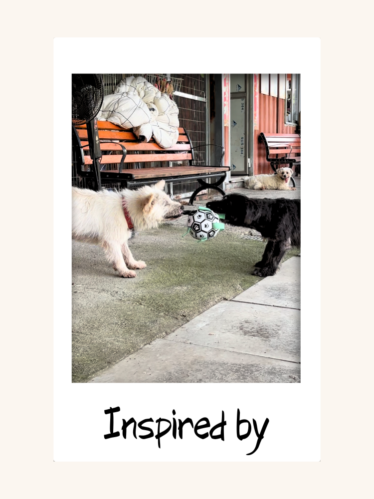 🐶 Inspiration — This design is inspired by two inseparable shelter dogs who became best friends the day they met. At the shelter, they can always be found tumbling in the grass, tugging on toys, and sharing every snack and nap. They remind us that even in the hardest times, the right friend can make life feel like playtime again.
